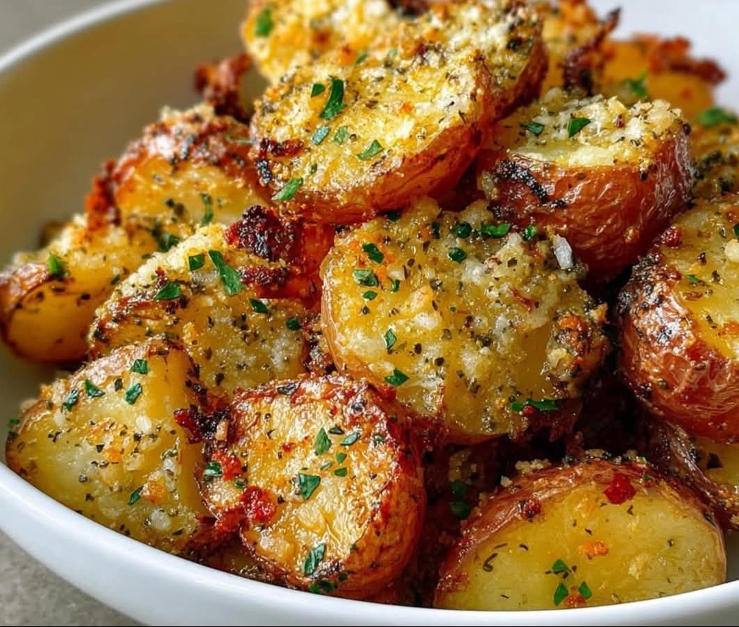 Add the halved baby potatoes to the bowl and toss until they’re well coated in the buttery garlic mixture.