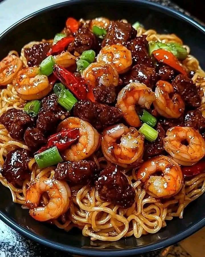 Return the cooked beef and shrimp to the pan. Pour in the prepared sauce and stir until everything is well coated. Let it simmer for 2 minutes to thicken. - Add the Noodles: