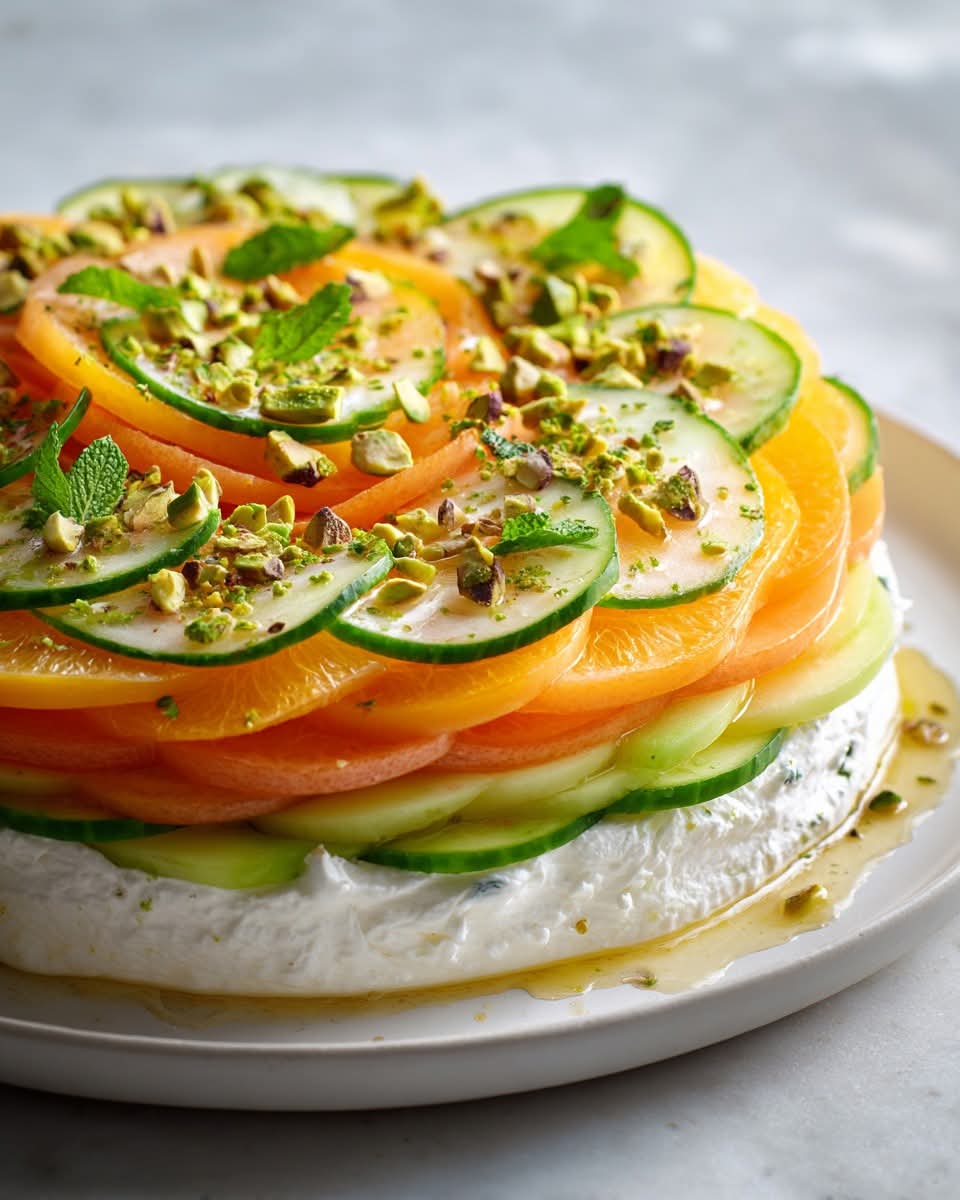 Delicate slices of melon and cucumber meet creamy feta, bright citrus, and a crunch of pistachio.