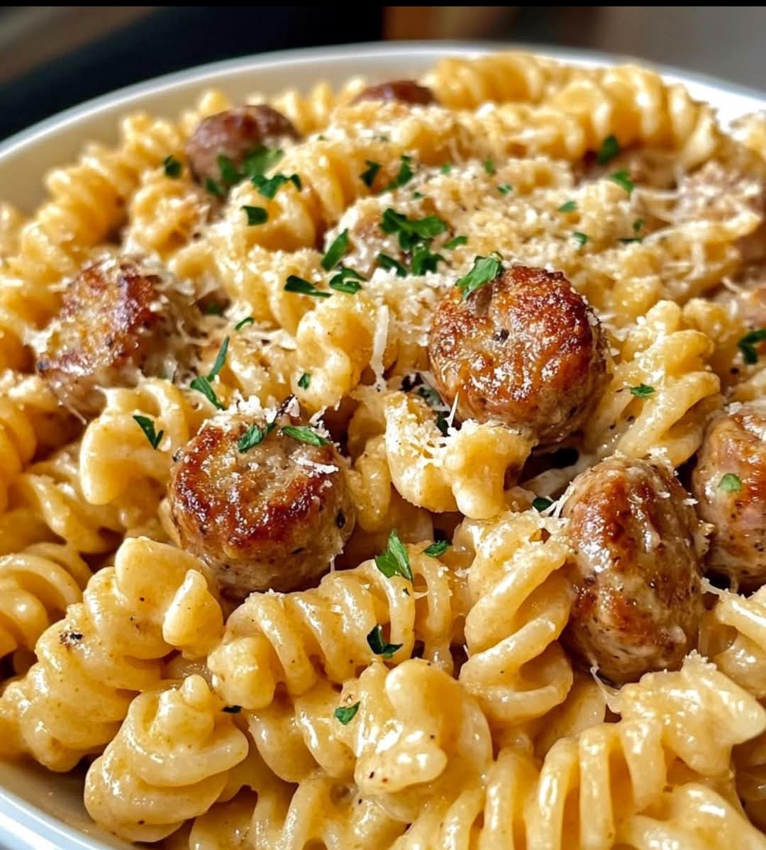 Add the cooked pasta to the skillet, tossing it in the creamy sauce. Add a little reserved pasta water if the sauce needs thinning. You can stir in the sausage bites or place them on top of the pasta. Garnish with fresh parsley.