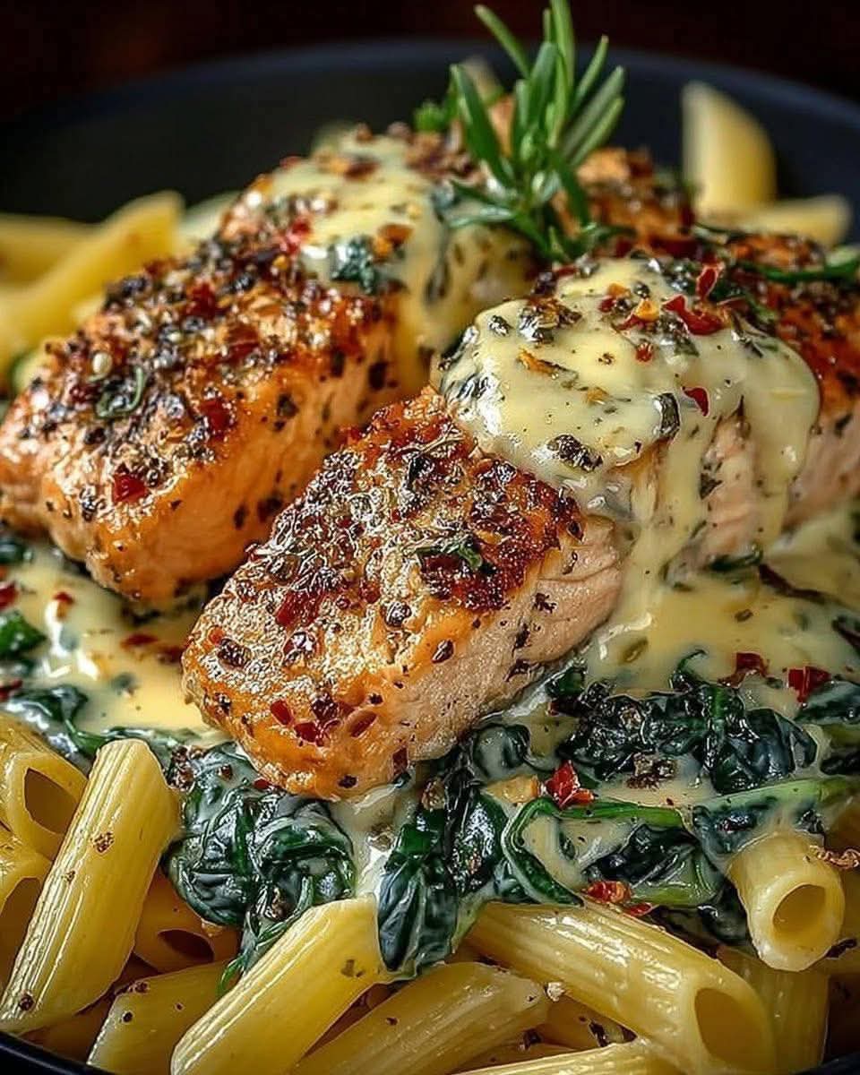 Place seared salmon on top of the pasta, garnish with parsley and extra Parmesan, and serve warm.