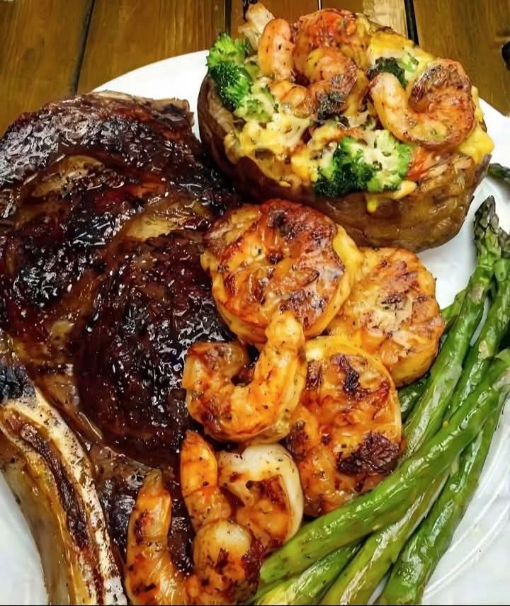 Ribeye Steak with Grilled Shrimp, Stuffed Potato & Asparagus