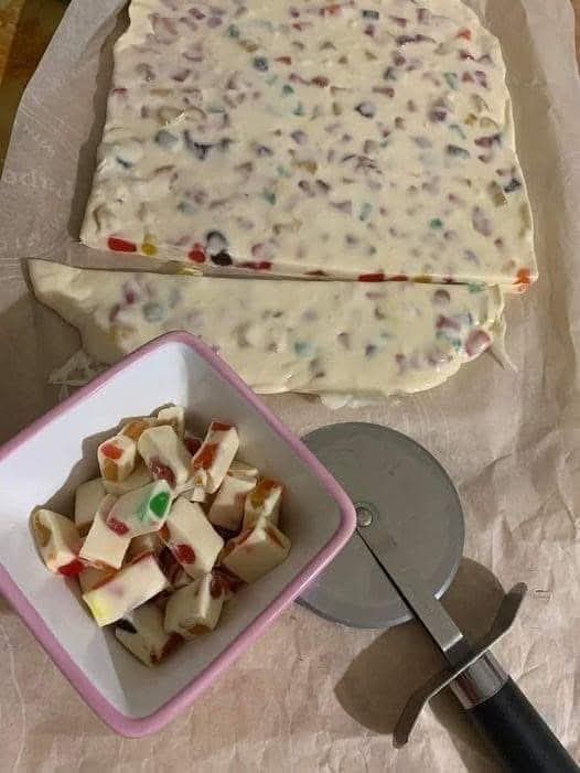 - Work quickly when adding peanuts and M&Ms — the nougat sets fast.