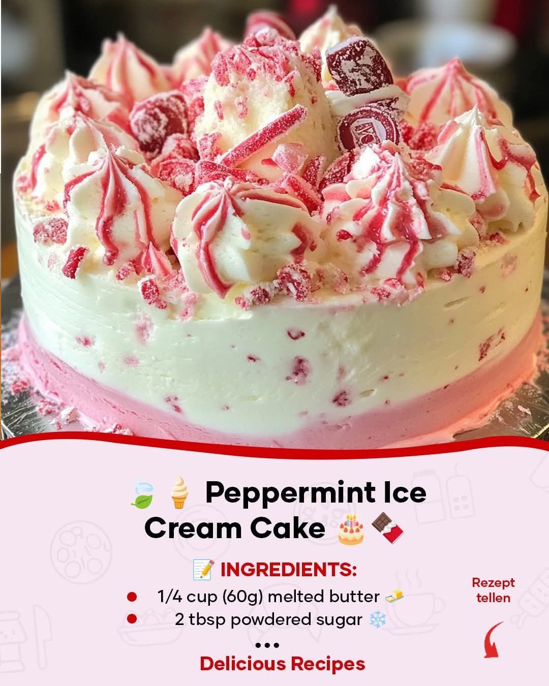 A peppermint ice cream cake is a layered frozen dessert that typically combines cake, ice cream, and peppermint flavoring. The structure often includes a base layer of cake or cookie crumbs, followed by peppermint ice cream, and sometimes an additional layer of chocolate or vanilla ice cream. The cake is finished with toppings such as whipped cream, chocolate ganache, or crushed peppermint candies.